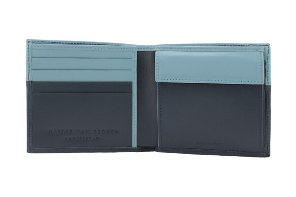 This wallet is part of the Amazone series, inspired by the merging of the Negro with the Solimoes rivers in Manaus, Brazil: each a different colour, which blend in a slow mélange surrounded by the amazing variety of colours in the tropical rainforest. It has a cash compartment that closes with a snap button, one large compartment over the whole width for your bills, 4 compartments for cards and two compartments for the miscellaneous.