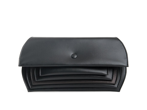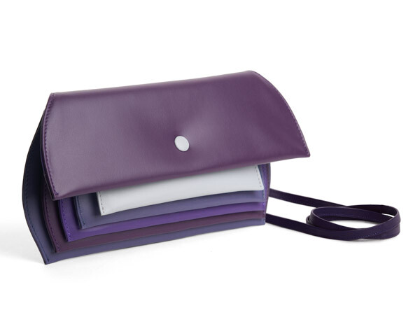 Because life is a party, this eye-catching clutch (detachable strap included) is constructed with layer upon layer of colour. A crossover between a high-end evening bag and a big wallet. When holding in the hand this object with five compartments opens elegantly like an accordion. It gives the user an overview of their total collection of money, credit cards, make-up and everything inbetween.