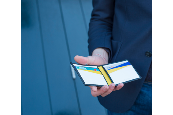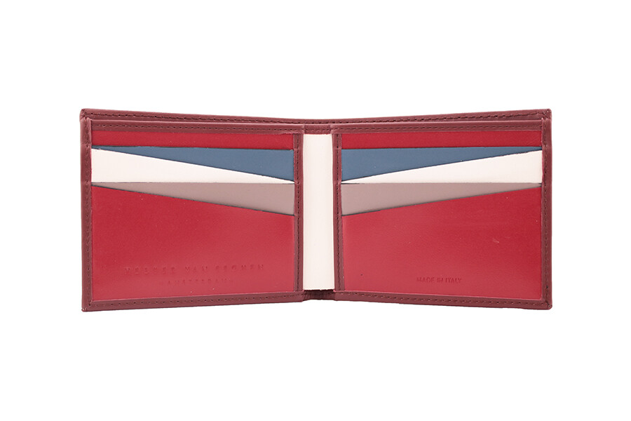 The double creditcard wallet is part of the diagonal series, developed from the drawings which I used to make as a child, composed of many lines and colours. The graphic drawings served as a basis and every line became a compartment in which something could be put. This series was been designed for people who wish to remain neutral on the outside but yearn for a dynamic inner life with elements of surprise. Each compartment is distinguished by another colour.