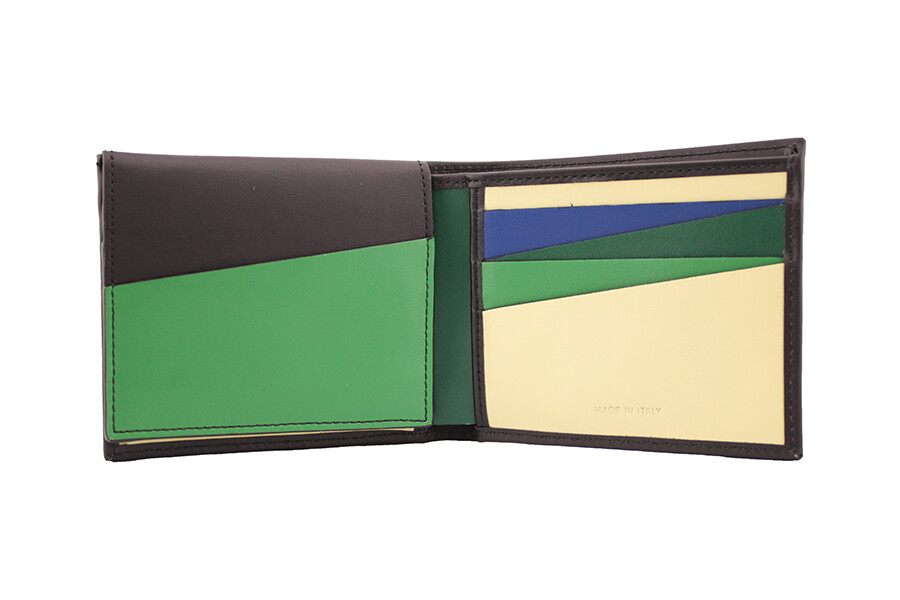 The triple card holder wallet is part of the diagonal series, designed for people who wish to remain neutral on the outside but yearn for a dynamic inner life with elements of surprise. Each compartment is distinguished by another colour.