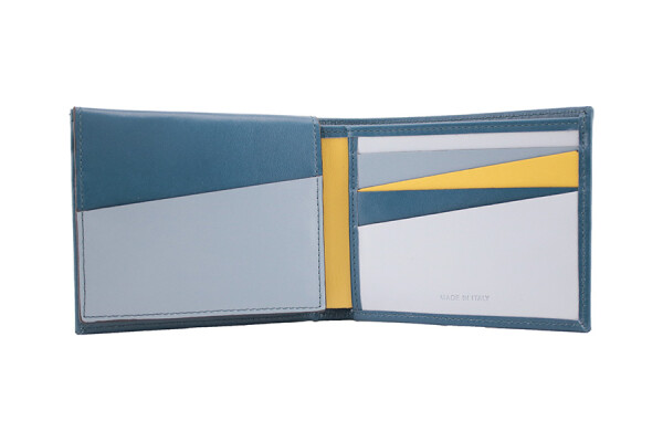 The triple card holder wallet is part of the diagonal series, designed for people who wish to remain neutral on the outside but yearn for a dynamic inner life with elements of surprise. Each compartment is distinguished by another colour.