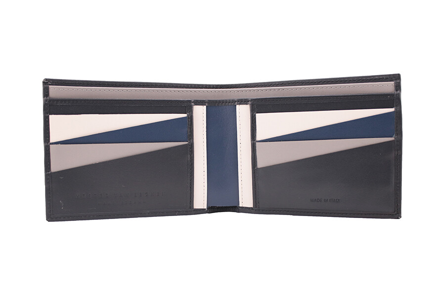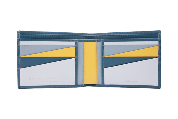 The double creditcard wallet is part of the diagonal series, developed from the drawings which I used to make as a child, composed of many lines and colours. The graphic drawings served as a basis and every line became a compartment in which something could be put. This series was been designed for people who wish to remain neutral on the outside but yearn for a dynamic inner life with elements of surprise. Each compartment is distinguished by another colour.