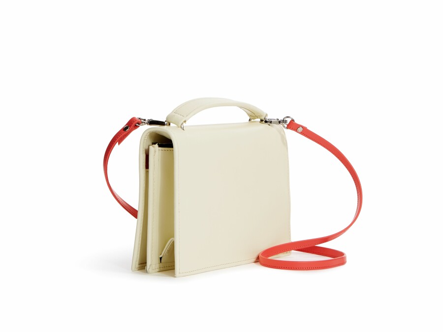 This compact rectangular mini-bag has been designed to provide space for a phone, credit cards, coins and bills, keys, and lipstick. An accompanying streamlined strap transforms it into an evening bag when one has to go out unexpectedly.