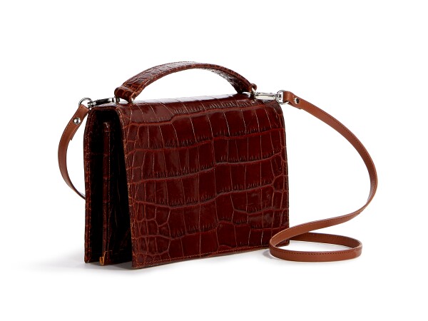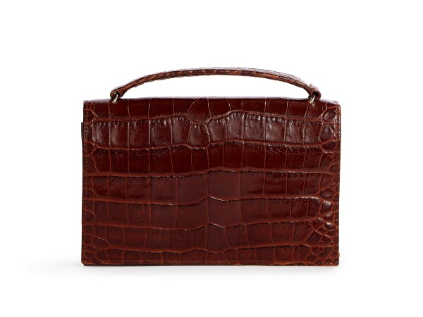 This compact rectangular purse fills the gap between a wallet and a bag and has been designed to provide space for coins and bills, a credit card, keys and a lipstick. An accompanying streamlined belt transforms it into an evening bag when one has to go out unexpectedly.
