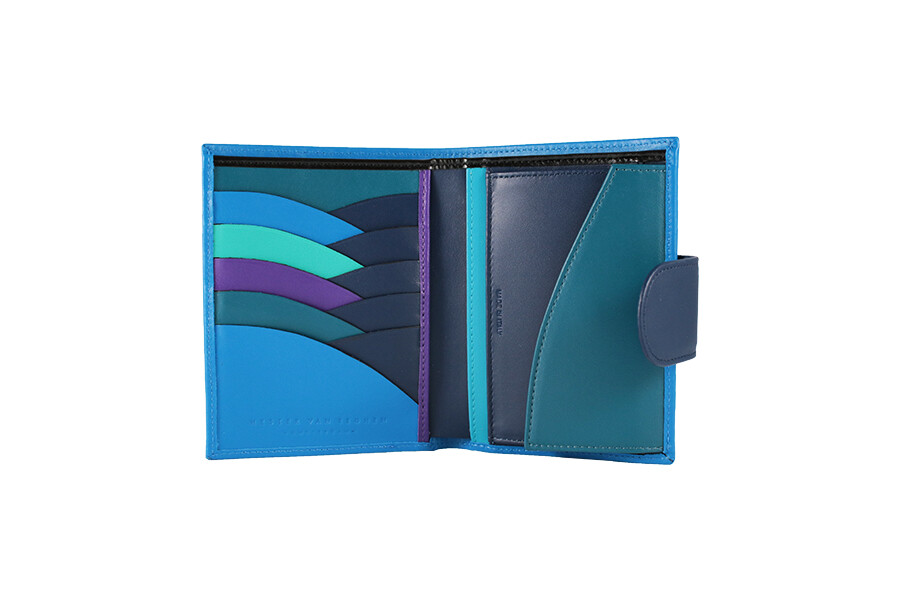 Looking through the window of a jetliner, the flocks of clouds are reminiscent of the compartments in this wallet. Gorgeous! The interior of this wallet is set apart by the "clouds", each one holds a credit card. The inside is all round, you won't find any corners here. Its larger compartments can hold a passport and cash.