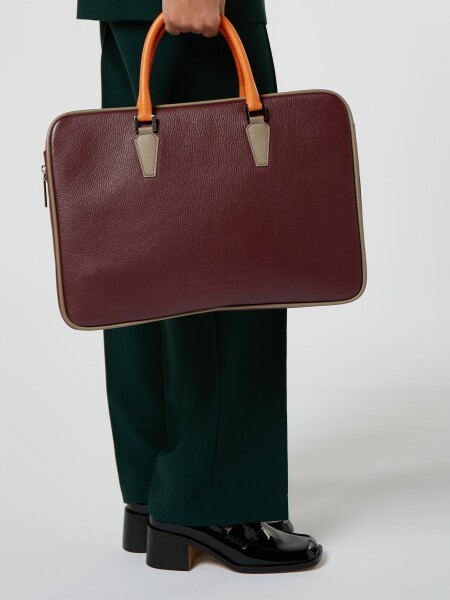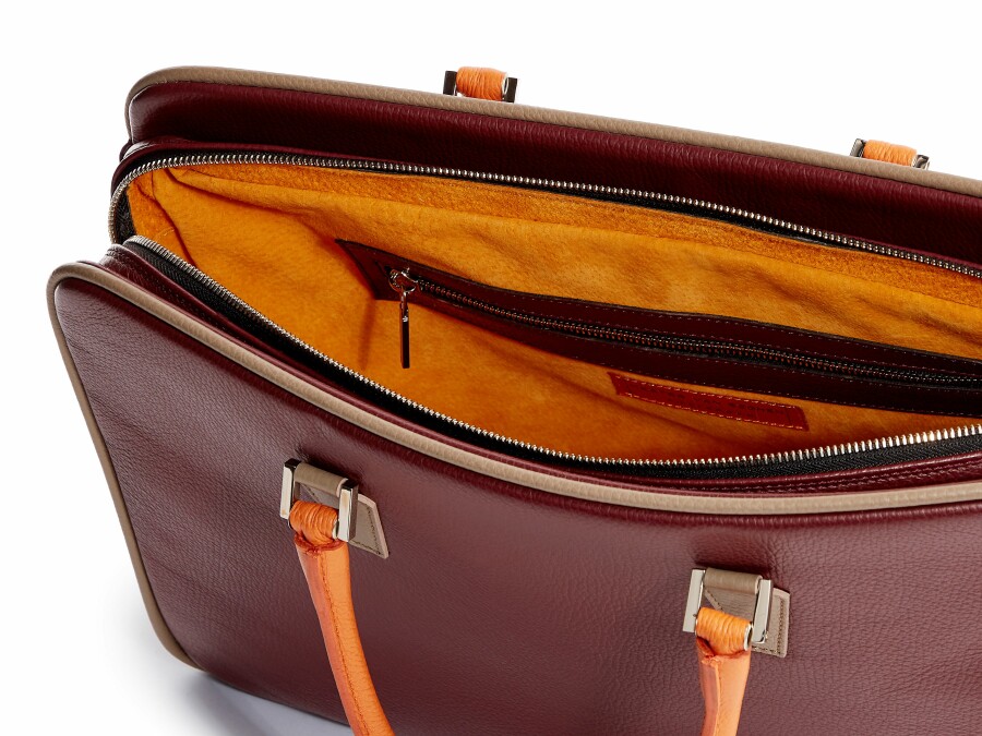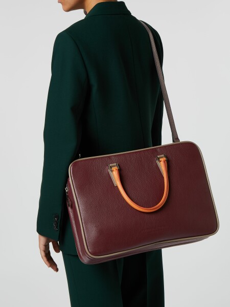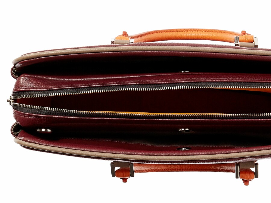 This tricolored grain-leather office bag, lined with leather and cotton, is the perfect bag for daily office. A zip-closed central compartment fits a laptop. The two side-compartments can be used for newspapers, slippers or private stuff. The bag can be carried by hand with two handles, or with a detachable shoulder strap.