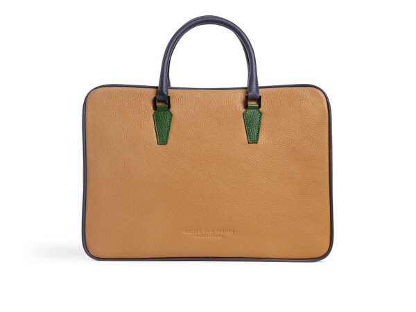 This tricolored grain-leather office bag, lined with leather and cotton, is the perfect bag for daily office. A zip-closed central compartment fits a laptop. The two side-compartments can be used for newspapers, slippers or private stuff. The bag can be carried by hand with two handles, or with a detachable shoulder strap.