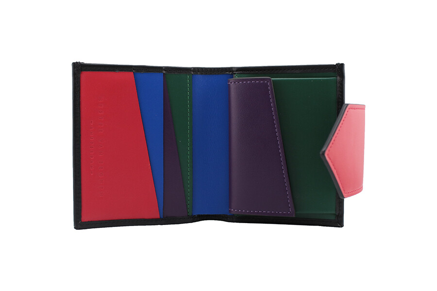 The small lip wallet is part of the diagonal series that has been designed for people who wish to remain neutral on the outside but who yearn for a dynamic inner life with elements of surprise. Each compartment distinguished by another colour.