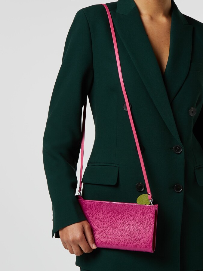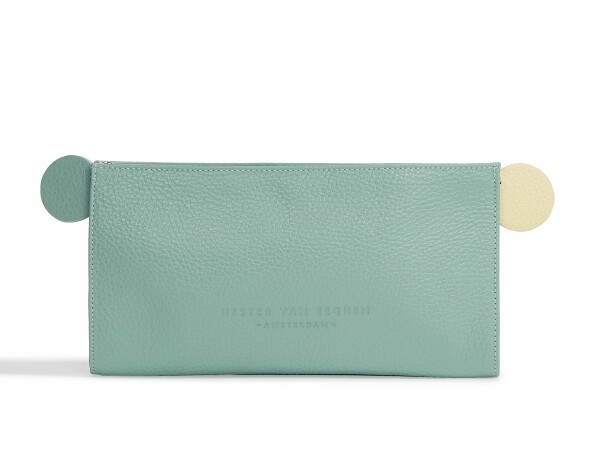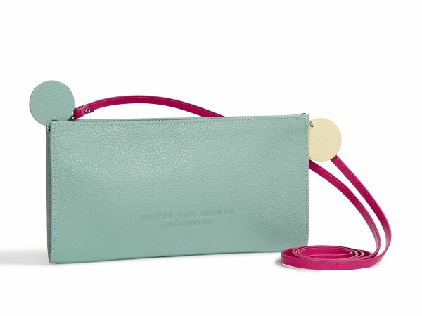 This companion piece to the Lost and Found bag is a useful little pouch with just as much fun. Keep your small treasures at hand, never lost, always found. Two-tone leather circle zip pulls are eye-catching accents. Larger than the regular Lost and Found and includes a strap.