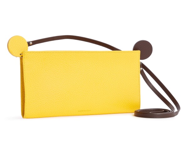 This companion piece to the Lost and Found bag is a useful little pouch with just as much fun. Keep your small treasures at hand, never lost, always found. Two-tone leather circle zip pulls are eye-catching accents. Larger than the regular Lost and Found and includes a strap.