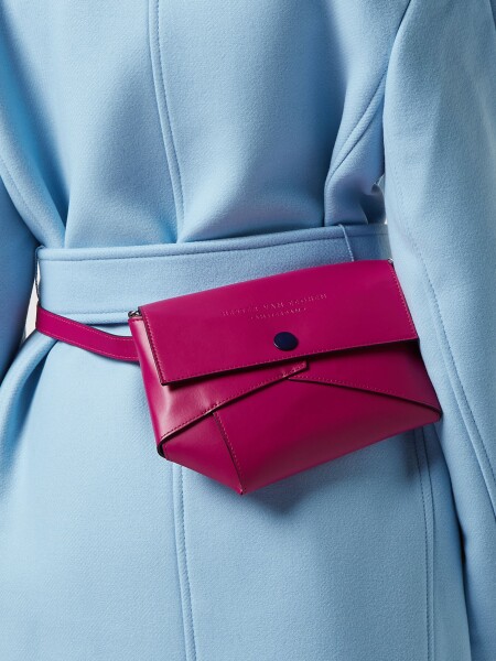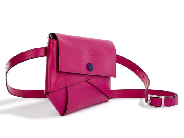 The bag can be worn over the shoulder, but also as a waist bag. Therefore it has two small leather loops on the back, through which you can weave the strap. The main compartment closes with a button, and on the inside there is a zip pocket.